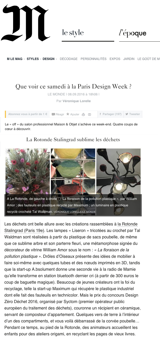 Paris Art – (January 2016)Tal Waldman in salon Maison&Objet 2016https://www.paris-art.com/tal-waldman-au-salon-maisonobjet-2016/