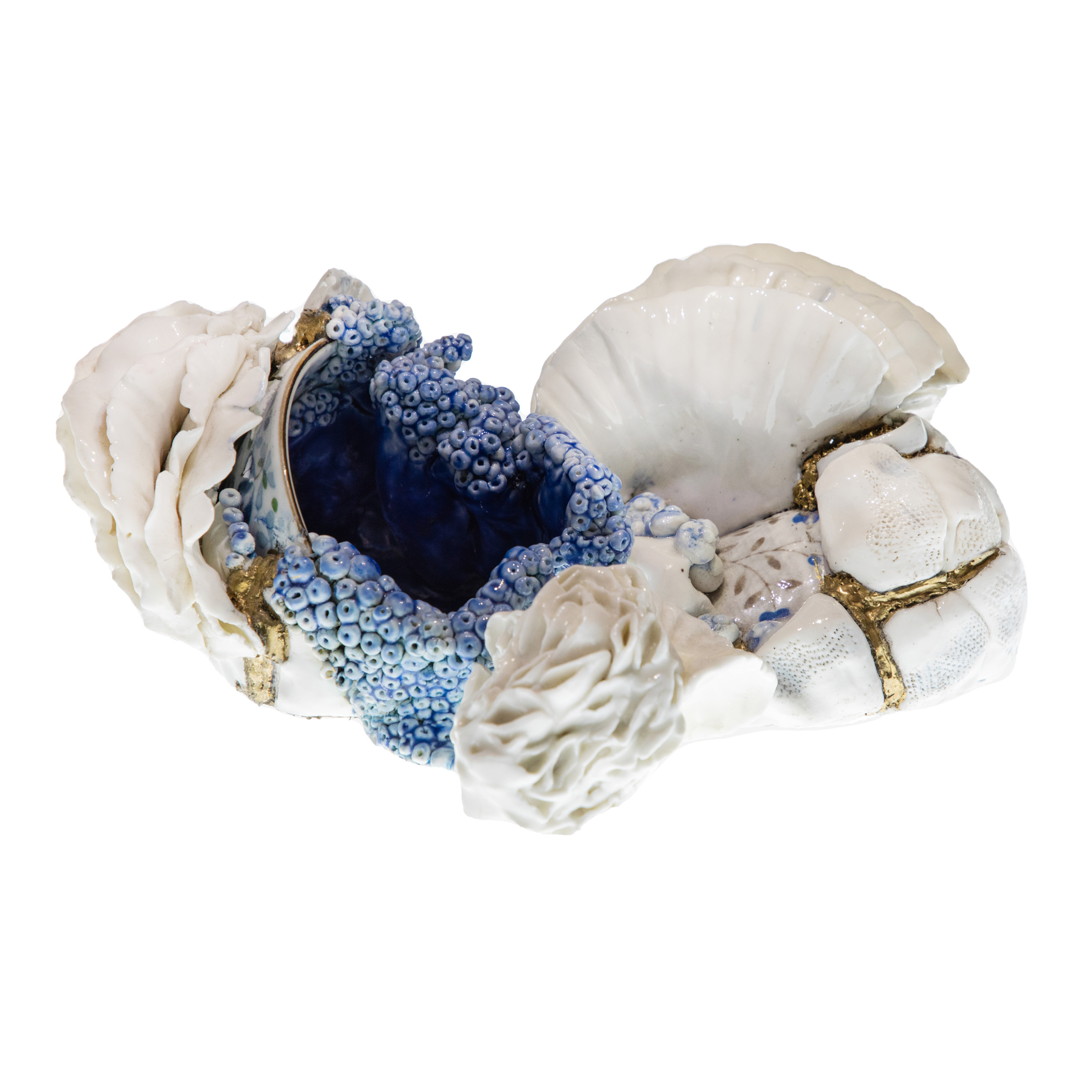 Pièces de la série « Golden Scars » de Tal Waldman. Fabriquées en porcelaine de papier, porcelaine recyclée, émaux et peinture. © Elsa Viollet